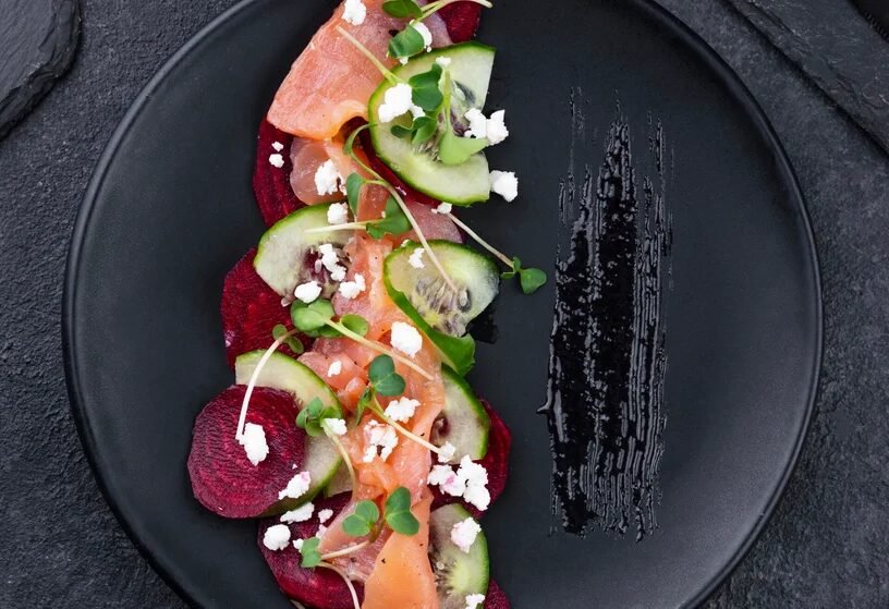 - Salmón ahumado: un plato de salmón fresco ahumado en frío, servido con eneldo, limón y una guarnición de crème fraîche.