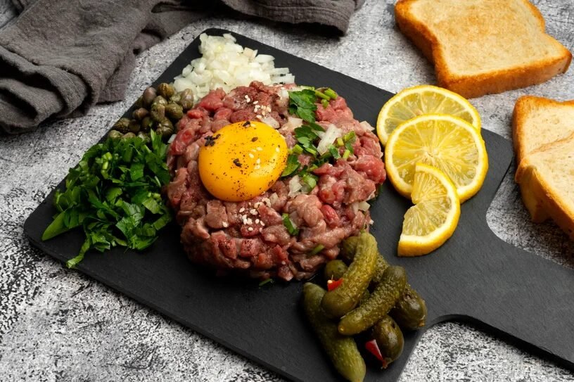 - Steak tartare: un plato de carne cruda finamente picada y condimentada, servido con tostadas y adornado con una yema de huevo cruda.