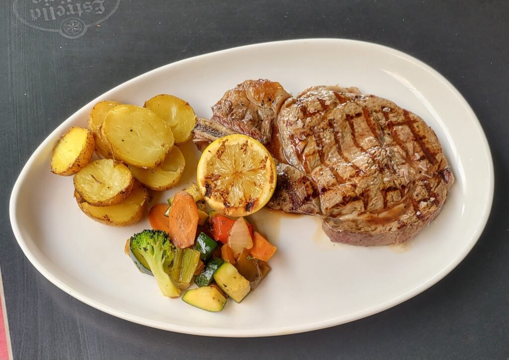 A la plancha con salsa de champiñones o queso azul, patatas y padrón.