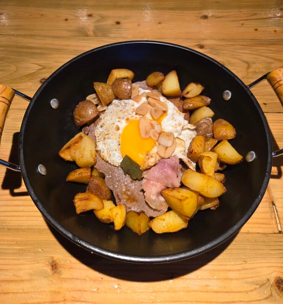 Patatas bravas cortadas a mano con salsa del chef al estilo AL ALBA (algo picante).