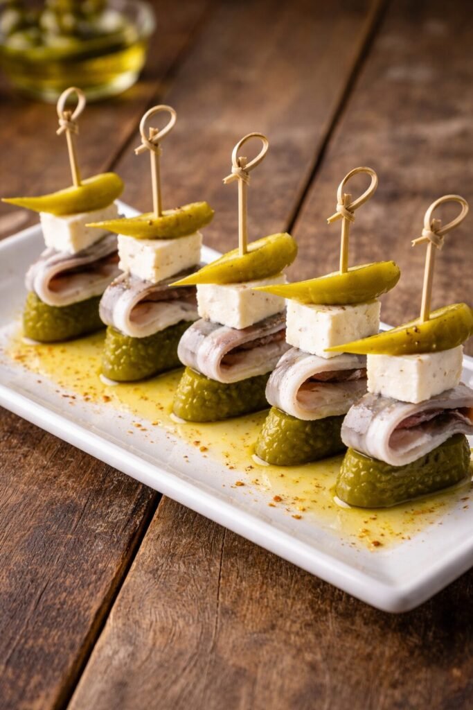 Pepinillo, boquerón, guindilla y queso de cabra.